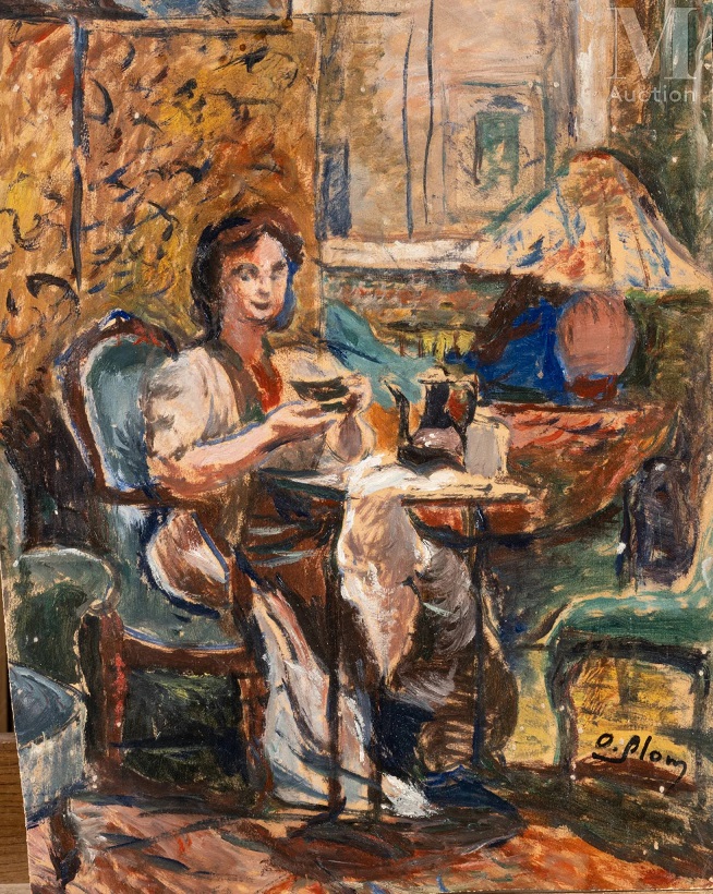 Lot 128. SLOMSZYNSKA Olga dite Olga SLOM (Suisse 1881- France 1941). Femme à la tasse de thé. Huile sur carton 46 x 37 cm. Signé en bas à droite “O. Slom”. Estimate 400 – 600 euro. Millon. 10/24/23. Not sold