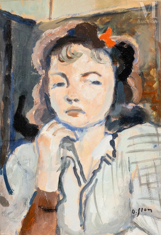 Lot 130. SLOMSZYNSKA Olga dite Olga SLOM (Suisse 1881- France 1941). Femme au nœud rouge. Huile et gouache sur carton 35 x 25 cm. Signé en bas à droite “O. Slom”. Estimate 300 – 400 euro. Millon. 10/24/23. Not sold