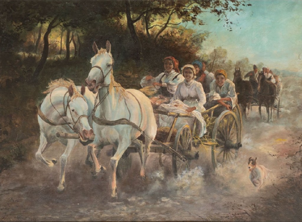 Lot 178. Polish School 19th Century, coach with girls and farmers in landscape, described bottom left, unreadable, framed, 75 x 100 cm. Art Antique Gallery & Auctioneers E. P. Deutsch. 11/21/23. Sold 7,900 euro.
