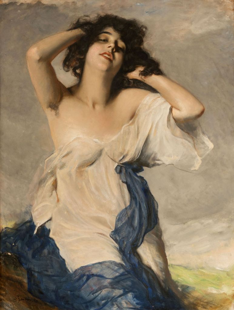 The works of the Polish artist Boleslaw von Szankowski bear witness to his ability to capture emotions and atmosphere in colours and forms. The painting offered here shows a young woman in a white robe with a blue shawl. Szankowski presents us with a portrait of timeless grace. The subtle use of light and shadow emphasises the fine details of the young woman and at the same time underlines her lightness, beauty and youth.