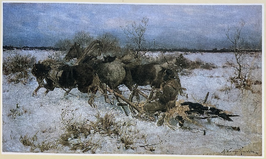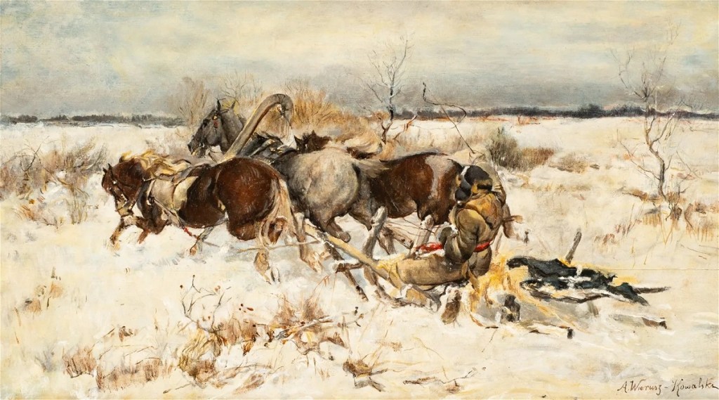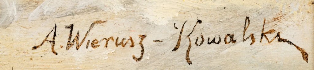 Wrócę w kilku wpisach do kolekcji malarstwa polskiego przechowywanego w Seminarium w Orchard Lake, USA. Pisałem niedawno o pracy Władysława Szernera z tej kolekcji, która została sprzedana w ubiegłym roku na aukcji w USA, podejrzewając jej kradzież (https://polishartcorner.com/2023/11/29/wladyslaw-szerner-1836-1915-7/). Jak jest naprawdę tego nie wiem. Wiadomo jedynie, że ośrodek ten ma sporo problemów i kto wie czy na tle bałaganu nie dochodzi obecnie do znikania obiektów. Po pracy Szernera przyszło mi obecnie pokazać obraz Alfreda Wierusza-Kowalskiego. O dziwo, obraz ten (na pierwszy rzut oka) był dwukrotnie licytowany ostatnio w USA. Raz został sprzedany w listopadzie ubiegłago roku za $4,000 (https://www.liveauctioneers.com/item/165736854_alfred-von-wierusz-kowalski-1849-1915) a drugi raz kilka dni temu już znacznie taniej (jako style of) bo za jedyne $450 https://www.liveauctioneers.com/item/169186547_winter-scene-style-of-alfred-wierusz-kowalski. Oryginał jest na płótnie, fals jest namalowany na desce.