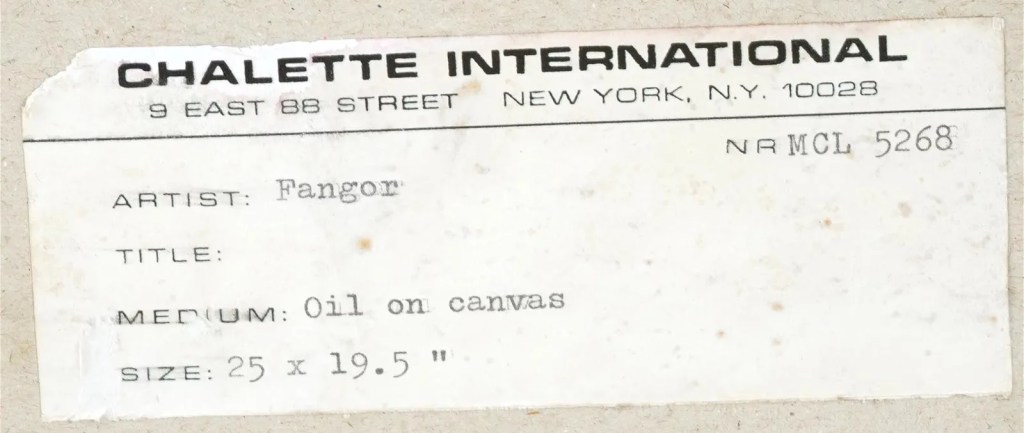 Nie tak dawno, bo październiku ubiegłego roku, Sopocki Dom Aukcyjny dał się nieźle nabrać na falsyfikat kredki rzekomo Wojciecha Fangora: https://polishartcorner.com/2023/10/29/fangor-w-sopockim-domu-aukcyjnym-cd/. Firma najadła się wówczas dużego wstydu, musiała po cichu przełknąć tę żabę na surowo, ale ujawnienie tej sprawy uchroniło ‘inwestora’ przed wydaniem na aukcji 100,000 – 140,000 złociszy, spodziewanych przecież przez SDA. Wracam do tej sprawy bo dom aukcyjny na Brooklynie, ten sam który przysporzył tyle zmartwień SDA, czyli Antique Arena, wystąpił właśnie z kolejną kredką „Wojcieck-a Fangora”, powyżej przedstawioną na fotografii. Nie piszę dlatego by znęcać się po raz kolejny nad SDA lecz dlatego, że może ta praca znowu rzeczywiście wylądować w polskich rękach. Obecnie obserwuję zawziętą bitwę o ten dobrze znany mi obrazek (licytacja już osiagnęła $3,700). Miałem go nawet w swoich rękach około dwa lata temu objaśniając antykwariuszowi, pracującemu kiedyś w nowojorskim Sotheby’s, dlaczego jest to falsyfikat i tym samym dałem pomysł by usunąć tego falsa z jego aukcji. Ta pognieciona kartka papieru (jakby psu z gardła wyjął i wyprasował na kolanie), oprawiona w ramę, opisana w dodatku z tyłu na podrobionej nalepce z Galerii Chalette jako olej na płótnie (!), krąży od kilku lat na amerykańskich aukcjach gdzie bywa od czasu do czasu sprzedawana ale i tak szybko powraca z coraz to niższą ceną estymacyjną. Antique Arena wyceniła ten obrazek na 100 – 150 euro, bo wszystko tak wycenia, Ta wycena jedynie pobudziła krążenie krwi oraz zawziętość i głód u koneserów sztuki Fangora licytujących ten BS.