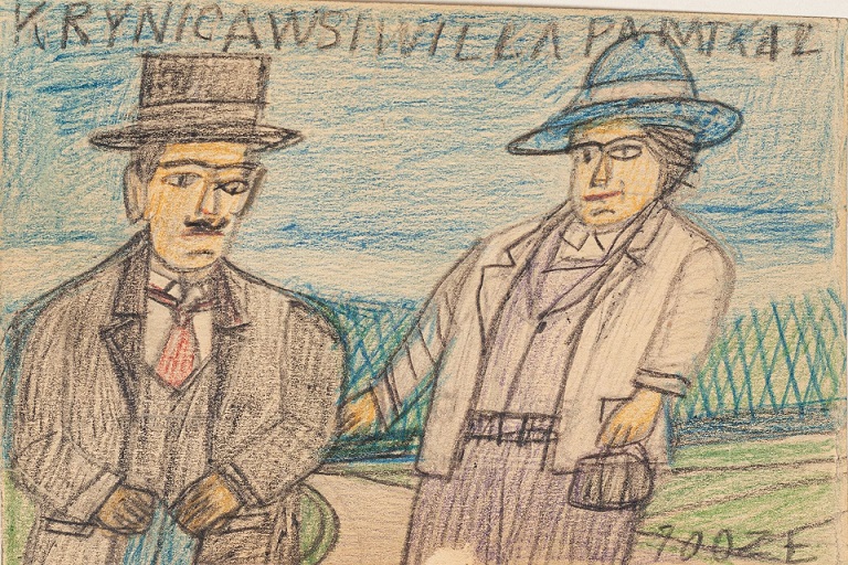 Lot 1043. Nikifor d. i. Epifaniusz Drowniak Krynica-Zdrój, 1895 – Folusz, 1968, 11,5 x 18 cm. Couple on a walk. Coloured pencil on paper. Private collection, Hessen. Nagel. 02/08/24. Sold 750 euro