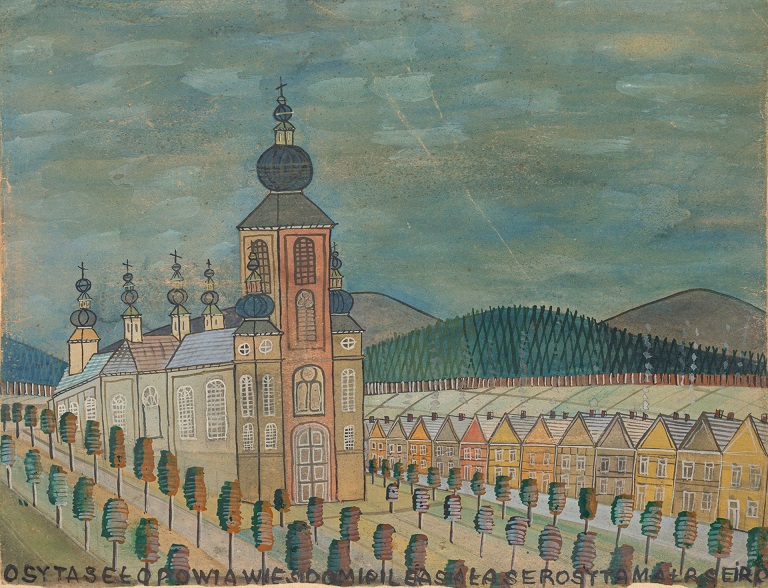 Lot 528. Nikifor d. i. Epifaniusz Drowniak. Krynica-Zdrój, 1895 – Folusz, 1968, 38,5 x 49 cm. Church with houses. Watercolour on paper. Private collection, Hessen. Nagel. 02/08/24. Passed