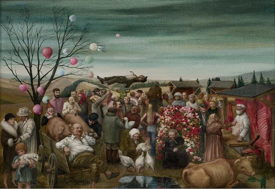 Zwrócił się do mnie czytelnik, który kupił powyższy satyryczno-surrealistyczny niezły obraz polskiego współczesnego malarza z pytaniem o o identyfikację artysty. Z tym pytaniem zwracam sie do czytelników bo sam nie potrafię odpowiedzieć.