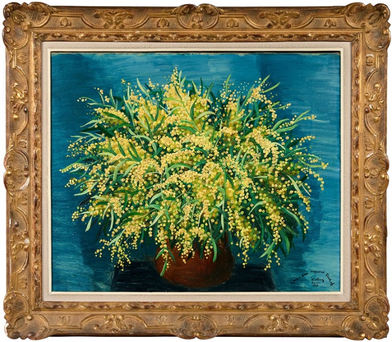 Lot 205. Moïse KISLING (1891-1953). Mimosas, 1947. Oil on canvas. Signed, annotated “Paris”, dated and dedicated “to my friend Raymond Fischof” lower right 54 x 65 cm. Estimate 60,000 – 80,000 euro. Osenat. 02/21/24. Sold 200,000 euro