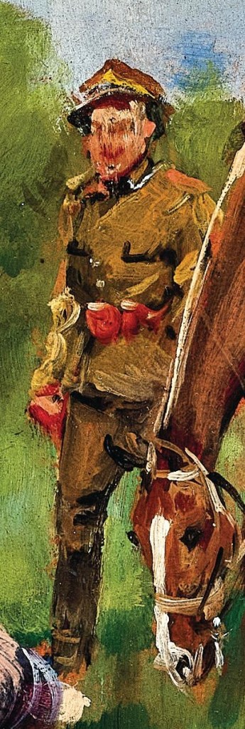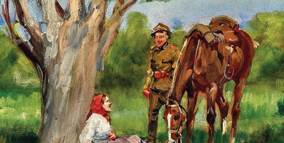 Lot 69. Jerzy Kossak (Krakau 1886-1955). Begegnung unter einem Baum, signiert, datiert Jerzy Kossak 1933, Öl auf Karton, 35 x 28 cm. Estimate 1,800 – 2,200 euro. Dorotheum. 02/21/24. Sold 1,900 euro
