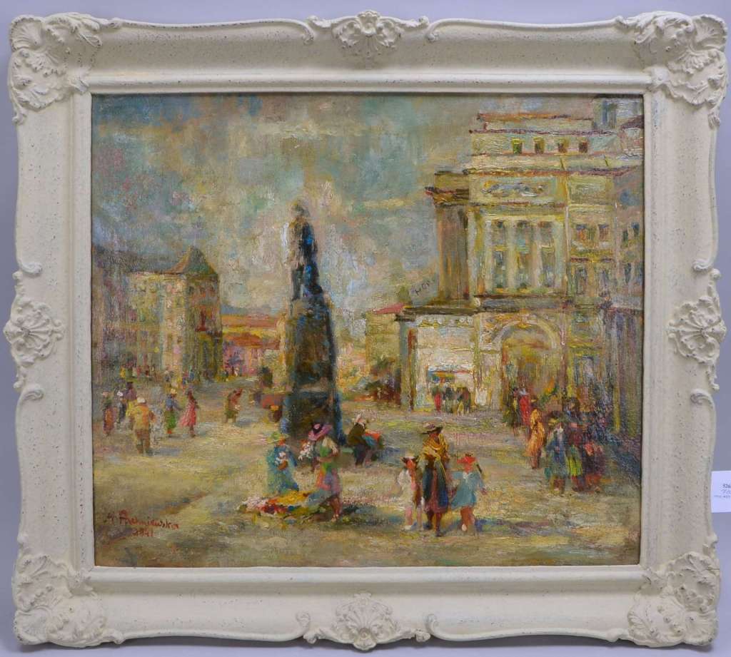 Lot 5268. Pachniewska, Hanna (1910 – 1987, zeitgenössische polnische Malerin), ‘Belebte Marktplatz-Szene in Polen‘, Öl/Lw, unten rechts signiert und datiert ‘1941’; Bildmaße 63 x 73 cm, Rahmenmaße 80 x 90 cm. Opening 700 euro. Auktionshaus Weser. 03/09/24. Passed