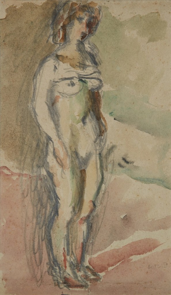 Lot 165. Henryk Gotlib, Polish/British 1890-1966 – Interior scene, c.1930s; watercolour and pencil on paper, 34 x 50.5 cm: together with 2 other works on paper by the same artist, ‘Standing nude, 1947′, watercolour and pencil on paper, signed lower right, 29 x 16.9 cm, cat.40 and ‘Robbie and man sitting under trees‘, pencil on paper, 10.3 x 14 cm, cat.288 (3) (ARR). Provenance: the Estate of the Artist. Exhibited: ‘Standing Nude, 1947’ and ‘Robbie and man sitting under trees’ – The Kilvery Gallery, Clyro (according to the label attached to the reverse of the frame). Estimate: £300 – £500. Roseberys. Sold 360 GBP