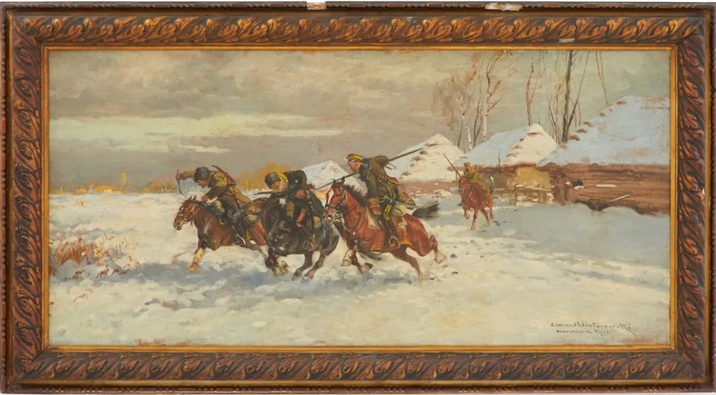 Lot 740. Leonard Winterowski (Polish, 1886-1927). “Uhlan Battle“, 1921, oil on canvas, signed, dated and localized “Warszawa” lower right, several canvas stamps en verso. Framed. 27-1/2″ x 55″, framed 34-3/4″ x 62-7/8″. Estimate $4,000 – 7,000. New Orleans Auction Galleries. 03/24/24. Sold $3,400