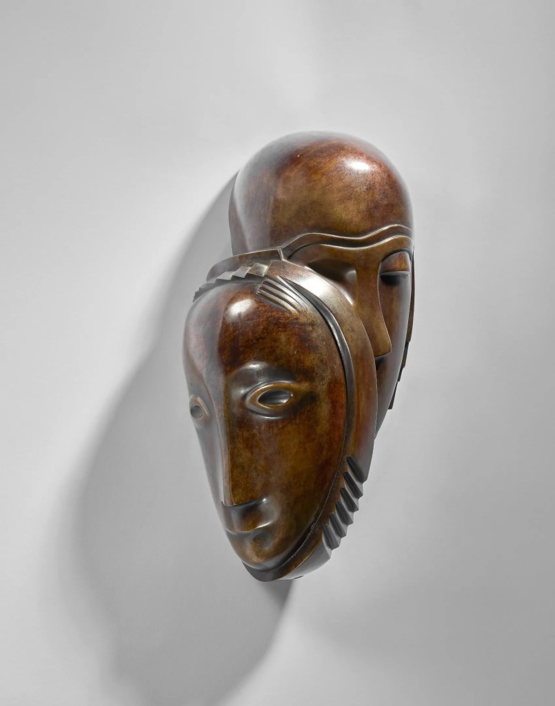 Lot 111. Jean LAMBERT-RUCKI. Double masque. Bronze à patine brune h:35.5 CM. Signé sur le côté droit “Lambert-Rucki” et cachet du fondeur sous le menton “CIRE / C.VALSUANI / PERDUE”. Fonte posthume. Provenance : Fonderie Valsuani. Acquis auprès de cette dernière par l’actuel propriétaire en 1977. Expositions : Vascoeuil, Château de Vascoeuil, Bronzes du XXe siècle, Fonte Valsuani, mai-octobre 1977, n°16, reproduit en couleur. Estimation : 3 000 € – 5 000 €. Sold 5,000 euro