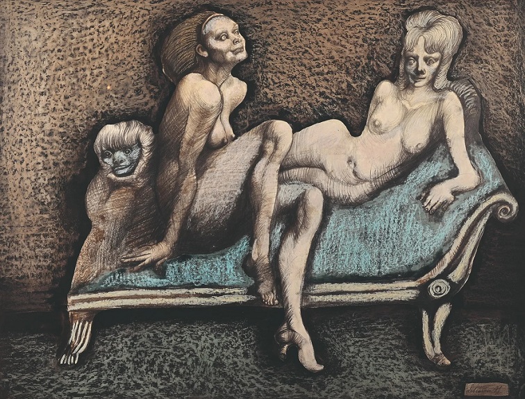 Lot 200. Jan LEBENSTEIN (1930-1999). Deux femmes à la méridienne, 1971. Technique mixte sur papier, signée et datée 71 en bas à droite. 48 x 62,5 cm. Estimation: 4 000 € – 5 000 €. Thierry de Maigret. 04/05/24. Sold 4,800 euro