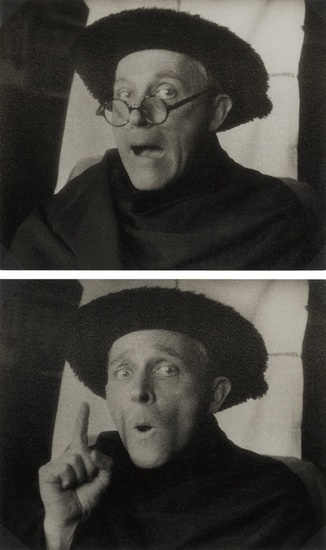 Lot 12. Stanisław Ignacy Witkiewicz 1885 – 1939. Improvised scene as a cleric, Zakopane. 2 gelatin silver prints, framed together; images approximately: 4¼ by 5 in. (10.8 by 12.7 cm.) Executed in 1932, printing date unknown. Estimate $10,000 – 15,000. Passed