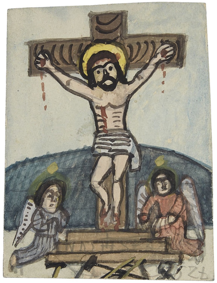 Lot 121. NIKIFOR (Poland, 1895-1968). NIKIFOR KRYNICKI. DIT CHRIST. Watercolor on paper. Signature stamp on reverse. Watercolor on paper; artist’s stamp on the reverse; 12,5 X 9 CM – 4 7/8 X 3 1/2 IN. PROVENANCE Henri Adam-Braun Collection. Sale, Ader, Tableaux modernes et contemporains – Collection Henri Adam-Braun, Paris, November 29, 2013, lot 351. Collection of Mr. and Mrs. F. M. L., France. Estimate 200 – 300 euro. Tajan. 04/10/24. Sold 1,100 euro