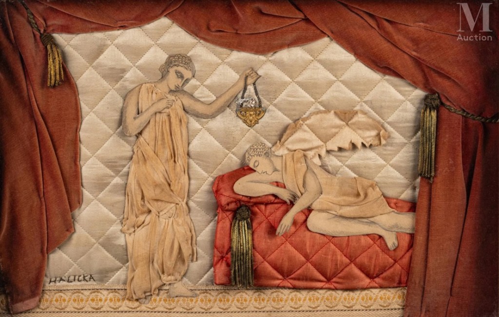 Lot 49. Alice HALICKA (Cracovie 1895 – Paris 1975). Love and Psyche, Padded Romance. Made in 1924 Collage, fabric and metal 30.5 x 47 cm on view. Signed lower left “Halicka”. On the back, dealer’s label Lucien Lefevre Foinet number 3804 and label Frères Bourlet and Sons. Estimate 4,000 – 5,000 euro. Millon. 04/23/24. Sold 9,500 euro