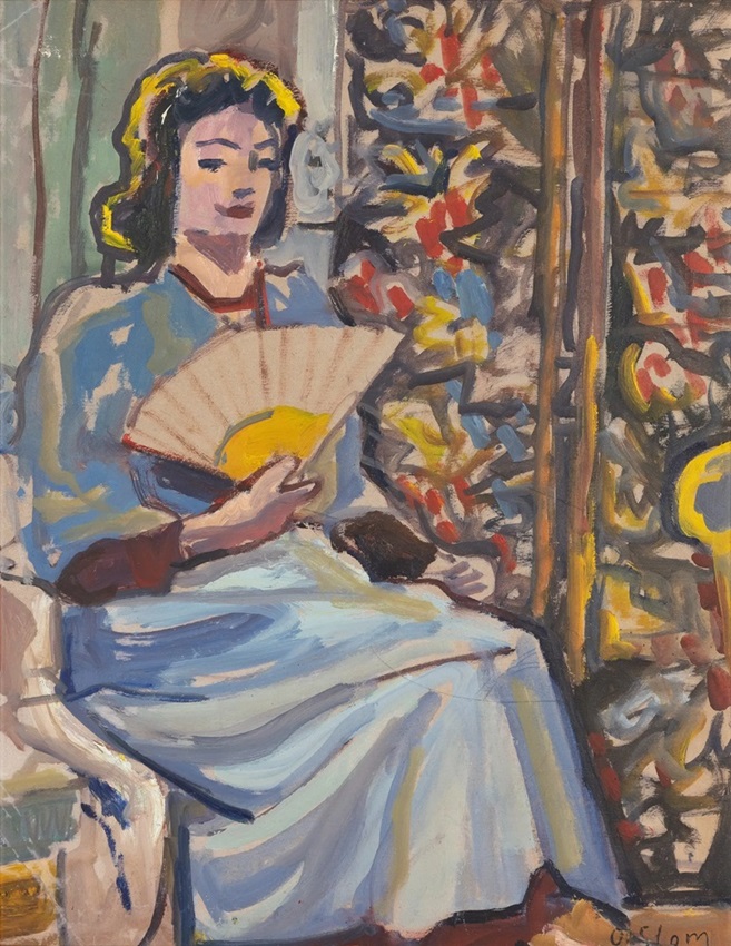 Lot 175. Olga SLOMCZYŃSKA known as SLOM (1881-1941). Woman with fan, ca. 1925-30. Oil on paper. Signed lower right. (Creases). 46 x 36 cm. Daughter of André Slom(czynski), himself an artist who fled to Switzerland after taking part in the Commune. Estimate 300 – 400 euro. Ader. 05/16/24