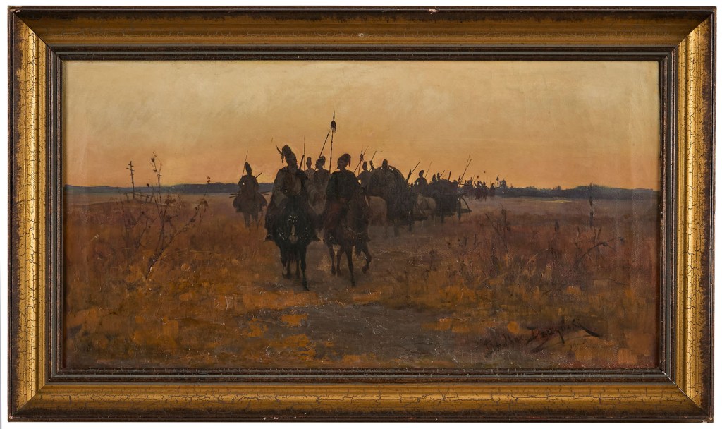 Rzadki z zapomiany malarz, uczeń Jana Matejki, monachijczyk. Obraz z aukcji wyraźnie ma wpływy szkoły monachijskiej, przemarsz taborów o zmierzchu przez ukraińskie pola. Dobre uzupełnienie do kolekcji ‘mniejszych’ monachijczyków. Praca prawdopodobnie wymaga prozaicznej konserwacji, zmiany werniksu, by obraz przejrzał; może jednak to być taka kolorystyka. Trzeba kupić by sie przekonać. Poniżej zamieściłem esej o tym malarzu autorstwa Krzysztofa Dudy.