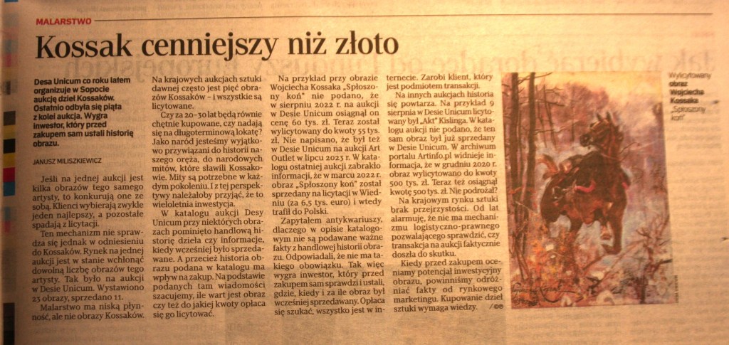 Chciallbym w tym miejscu złożyć na ręce Pana Redaktora Janusza Milszkiewicza podziękowania dla Niego jako autora we. tekstu oraz również kierownictwa redakcji dziennika “Rzeczpospolita” za ten ważny glos w sprawie oczywistej oczywistości (na rynku światowym nie na polskim ryneczku sztuki) tj. koniecznosci wprowdzenia transparentności w zakresie obrotu dziełami sztuki w Polsce w XXI w. w tym szczególnie dbania chociaz o wyczerpujący opis proweniencji i estymacji (bo od czegos w koncu nalezy zacząc) danego dziela w opisie aukcji. Nie uwazam, zeby głos ten był li tylko tzw. głosem wołajacego na puszczy.