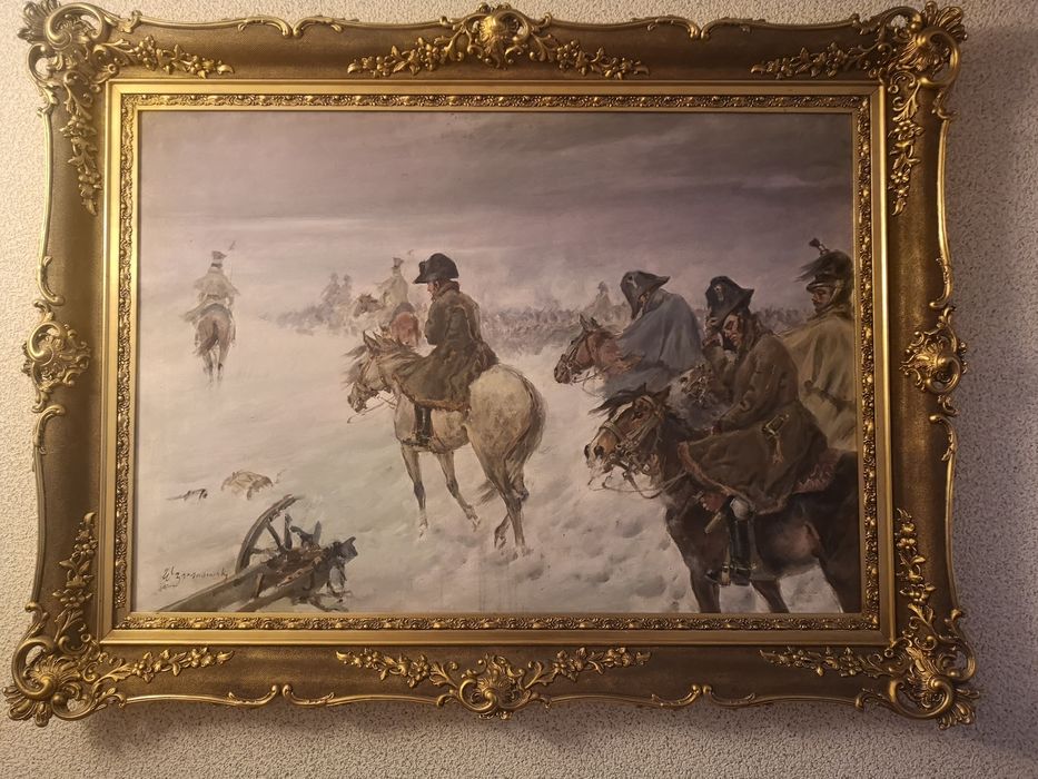 “Odwrót Napoleona z pod Moskwy. Duży obraz olejny na płótnie Szkoła i bliski przyjaciel Kossaków nazywany Kossakiem toruńskim. Idealny do gustownych salonów, gabinetów, pokoi dyrektorskich. Światło obrazu 98 x 68.z ramą 125 x 94”.