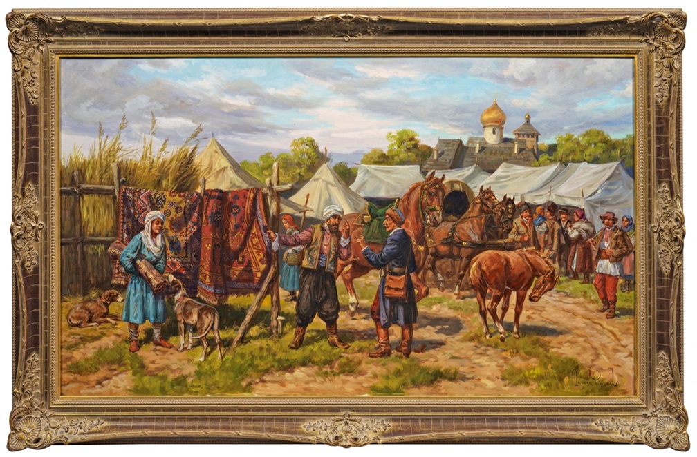 Lot 2387. Leszik Piasecki (1928 Lemberg/Lwów/Lwiw – 1990 Wien). Traditioneller Markttag in einem Dorf in Südrussland mit Teppichverkäufer. Nostalgische, vielfigurige Szene aus dem 19. Jh.; Piasecki malte mit Vorliebe Schlachten-, Reiter- und Pferdemotive, wie sie auch in diesem Gemälde wiederkehren. Er lernte und arbeitete in den Privatateliers von Stanislaw Batowski, Zygmunt Rozwadowski und Jerzy Kossak und studierte nach dem 2. Weltkrieg an der Krakauer Akademie. 1974 ging er mit seiner Familie nach Wien und richtete sich dort ein eigenes Atelier ein. Öl/Lwd.; 70 cm x 119 cm. Rahmen. Oil on canvas. Signed. Starting 2,400 euro. Sold 2,400 euro