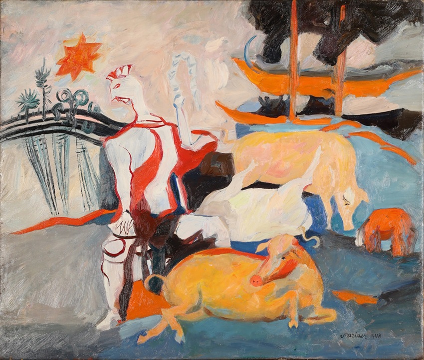 Lot 190. Marian Koscialkowskiego, Lithuanian 1914-1977 – Untitled’ (White Prince with Pigs), 1948; oil on canvas, signed and dated lower right ‘Marian 1948’, 50.5 x 61 cm. Estimate £500 – £700. Reseberys. 09/11/24. Sold 480 GBP