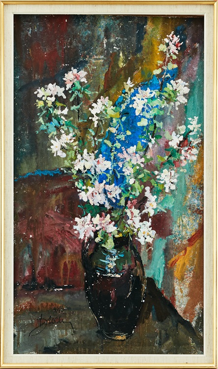 Lot 309. Antoni Suchanek Polen 1901-1982. Blomsterstilleben – dubbelsidig. Signerad Suchanek på båda sidor. Olja och gouache på pannå, 99,5 x 57 cm. Estimate 8,000 – 10,000 SEK (€ 710 – 900). Sold SEK 13,000