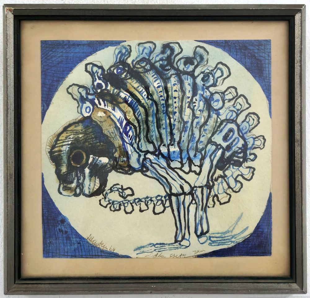 Lot 112. Jan Lebenstein – ‘Creature of Bones‘. Jan Levenstein (Poland, 1930-1999), marker drawing, ink and watercolor on paper. Signed and dated: 1964. Dimensions: 16 x 17 cm. Frame dimensions: 21.5 X 22 cm. Estimate $800 – 900. Aqua Arts and Antiques. 09/19/24. Sold $700
