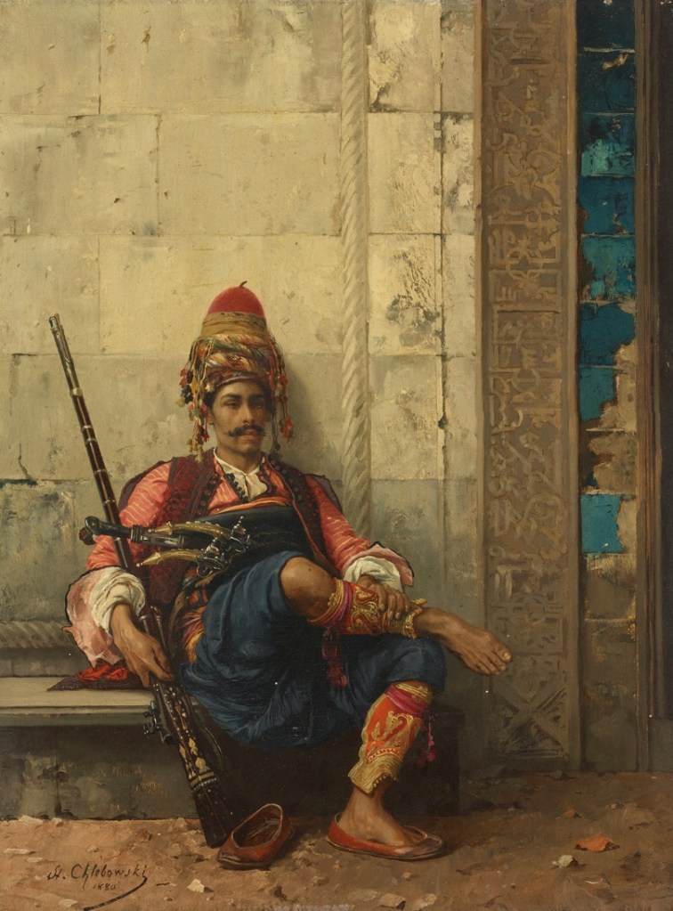 Lot 61. STANISLAUS VON CHLEBOWSKI (POLISH, 1835-1884). Zeybek à Brousse (Bursa), signed and dated ‘St. Chlebowski/1880’ (lower left), oil on panel, 13 ¾ x 7 ½ in. (35 x 19.1 cm.). Provenance: The artist; with Goupil et Cie., New York, acquired directly from the above, June 1880. Private collection, Boston, acquired directly from the above, 28 July 1880. By descent to present owner. Estimate $20,000 – 30,000. Christie’s. 10/09/24. Sold $60,000