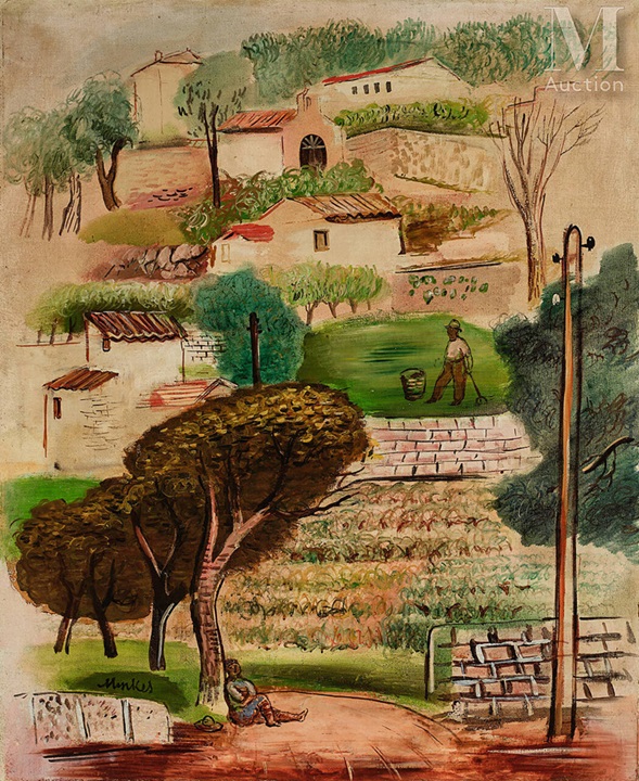 Lot 16. Zygmunt MENKES (Lvov 1896 – New York 1986). Les terrasses. Circa 1924-1926. Huile sur toile double face, 60 x 73 cm. Signé en bas à gauche Menkes. Etiquette au dos de la galerie de Berri avec les mentions manuscrites “n°72 bis Menkes paysage”. EStimate 20,000 – 30,000 euro. Millon. 10/22/24. Sold 35,000 euro.