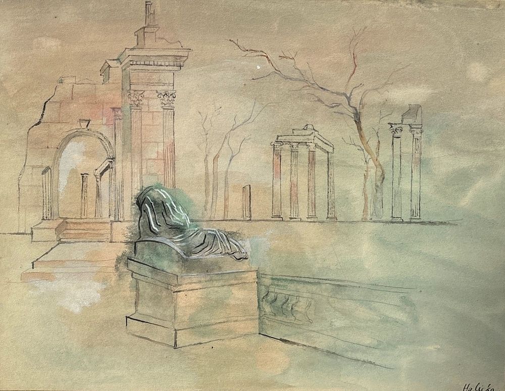 Lot 33. Alice Halicka (1895 – 1975) – Capriccio con rovine, tecnica mista su carta, 23 x 3o cm. Firmato in basso a destra. In cornice. Estimate 800 – 1,200 euro. Dams (Italy). 10/25/24