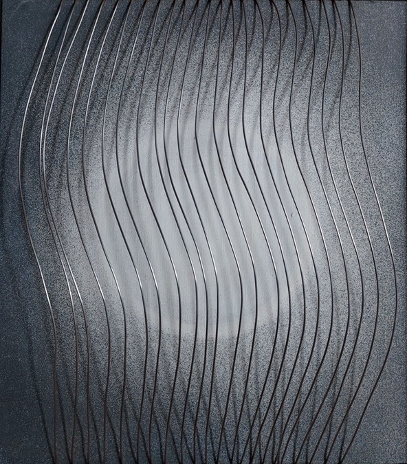 Warto przywołać w tym miejscu chyba jedyną pracę, która umożliwia bez oglądania jej na żywo, zrozumienie w jaki sposób Artystka pokrywała swoje prace metalowymi lub nylonowymi strunami w celu uzyskiwania niezwykłych refleksów świetlnych i kolorystycznych.