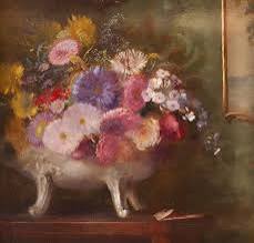 Nie mogłem doszukać się sygnatury na tej niecodziennej i pełnej światła kwiatowej martwej naturze Otolii Kraszewskiej – zakładam, że inni mieli lepsze oczy lub lepsze dodatkowe fotografie. Bardzo dekoracyjny obraz.