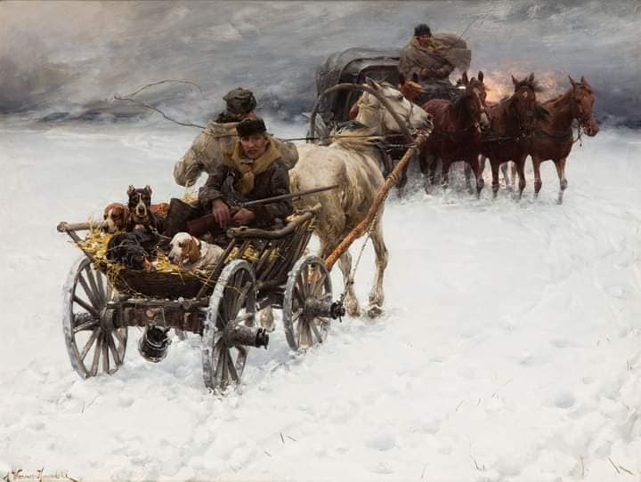 Jak ktoś mówi Wierusz-Kowalski to się myśli zaprzęgi i trojki konne. Dzisiaj zdałem sobie sprawę z jakim wyczuciem i ciepłem Wierusz portretował ‘najlepszego przyjaciela człowieka w tym szlachty – psy. Jakie słodkie są te psiaczki jadące saniami na miękkim posłaniu z siana.