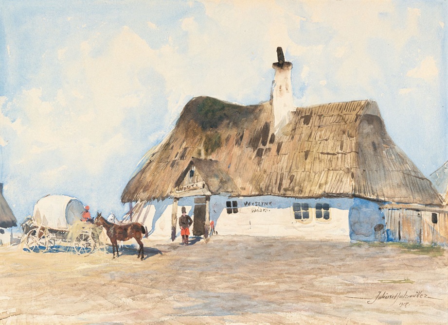 Lot 3111. Julius Holzmüller (1876 Bollchow – Lemberg 1932) – Rast vor dem Wirtshaus. Aquarell auf Velin, ganzseitig aufgezogen auf Pappe. 1908. 27 x 31,8 cm. Signiert und datiert unten rechts. Auf Rahmenrückwand mit Rest eines Sammlerstempels (nicht bei Lugt). Vereinzelt im rechten Rand Kleberückstände (wohl montierungsbedingt), ansonsten in guter Erhaltung. Opening 600 euro. Karl und Faber. 11/18/24. Passed