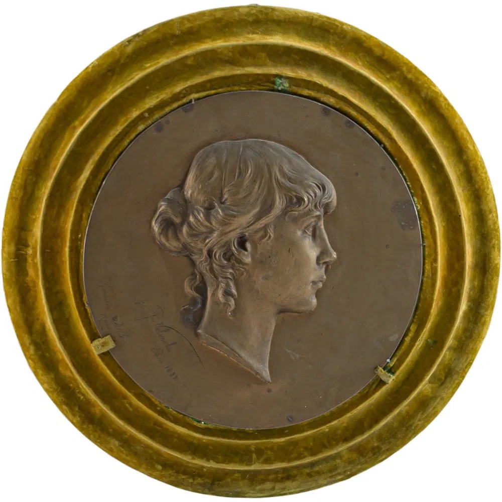 Lot 474. PIU ADAMOWITSCH WELONSKI (Poland 1849 – 1931). Head of a maiden. Bronze high relief, lost-wax casting. Signature and date on left Rome 1882. Nelli Foundry Rome. 43 cm Ø. Estimate 800 – 2,000 euro. Benedetto Trionfante Auction House S.r.l. 12/04/24. Sold 1,200 euro