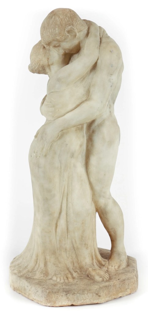 Lot 198. Glicenstein, Enrico (Henryk) (Polish/Jewish/American, 1870-1942), Embrace [aka Twilight, Lovers and The Kiss], marble sculpture, 1897, signed H. Glicenstein/Roma/1897 on the base, 23.5 inches tall, the base 11 inches wide. Catalogue Raisonne number 9. A copy of the catalogue raisonne, which reproduces this sculpture on the front cover, is included with purchase. Exhibited: Glicenstein Retrospective, Germany, 1912; Venice Biennale, 1926; Andersen Galleries, NYC, 1928; Central Synagogue, NYC, 1928. Inspired by the artist’s wife’s first pregnancy and reminiscent of the work of Rodin, who was a close friend of the artist. Provenance: The Estate of Hugo Dreyfuss, the son-in-law of the artist (married to Beatrice Glicenstein). Estimate $3,000 – 5,000. Sold $7,000