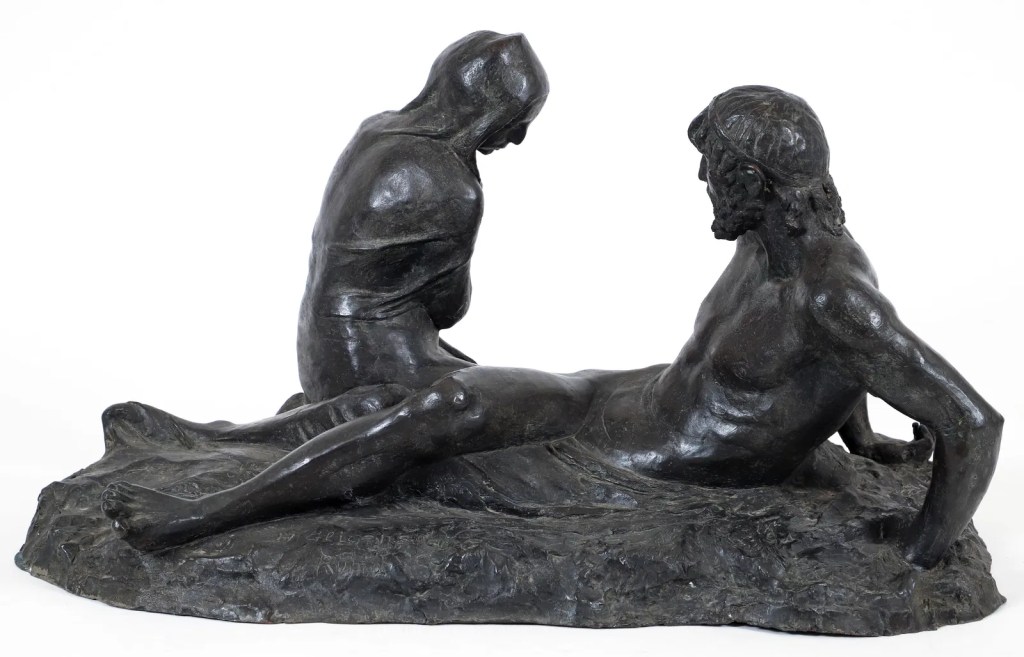Lot 200. Glicenstein, Enrico (Henryk) (Polish/Jewish/American, 1870-1942), Ruth and Boaz, c.1912, cast bronze sculpture, signed H Glicenstein/Roma, 16.5 x 29 x 14 inches. Catalogue Raisonne number 49, Caste One. Provenance: The Estate of Hugo Dreyfuss, the son-in-law of the artist (married to Beatrice Glicenstein). Estimate $2,000 – 3,000. Concept Art Gallery. 12/07/24. Sold $11,000