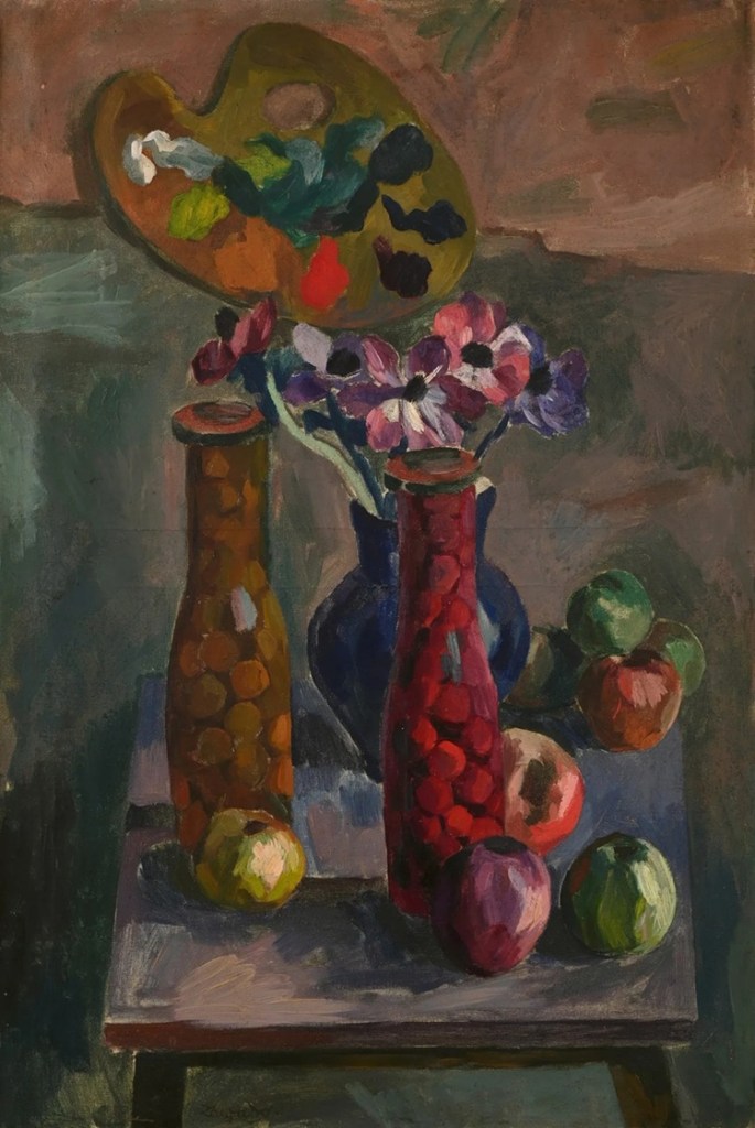 Lot 150. Jan Waclaw ZAWADOWSKI known as ZAWADO (1891-1982). Still Life with Palette, Vases and Apples, circa 1920-1923. Oil on canvas, signed lower middle. 73 x 50 cm. Provenance : – Monsieur & Madame R., circa 1930 * – By descent to current owners Bibliography: – This work will appear in the catalog raisonné of the Zawado oeuvre currently being prepared by Madame Cazier. We would like to thank Madame Cazier, the artist’s granddaughter, for the information she kindly provided. * Mr. R. was a letter carrier and his wife a janitor at 3, rue Joseph Bara, both of whom lived in the janitor’s lodge in Paris. This mythical building was home to many artists, including Kisling on the 4th and 5th floors, Soutine and Pascin, as well as the art dealer Léopold Sborowski on the 2nd floor. Modigliani often came to work at his dealer’s (The website http://www.zawado.net/ indicates that in 1919, he [Zawado] returned to Paris, and later moved into Modigliani’s studio, where he died in 1920). As a letter carrier, Mr. R. had time on his hands and was happy to help with odd jobs for the tenants of 3, rue Joseph Bara, and their visiting friends. In exchange for his services, the latter gave him many paintings, including these two. Estimate 1,000 – 1,500 euro. Sold 1,600 euro