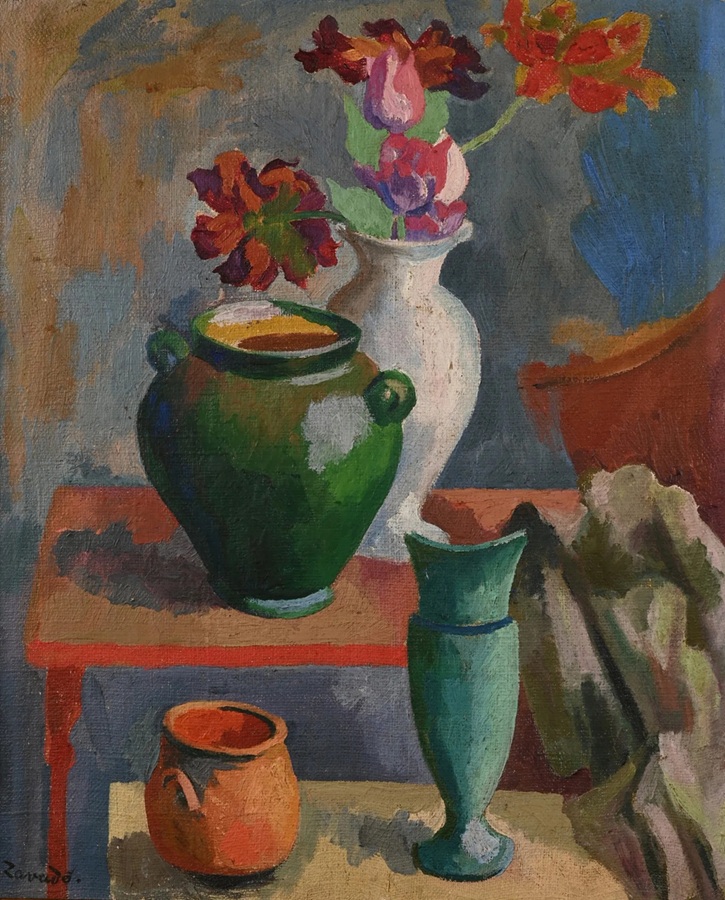 Lot 151. Jan Waclaw ZAWADOWSKI known as ZAWADO (1891-1982). Still life with a vase of tulips and pots, circa 1920 – 1923. Oil on canvas, signed lower left. 65 x 54 cm. Provenance : – Mr. & Mrs. R., circa 1930 – By descent to the present owners Bibliography: – This work will appear in the catalog raisonné of Zawado’s work currently being prepared by Madame Cazier. We would like to thank Madame Cazier, the artist’s granddaughter, for the information she kindly provided us with, and for pointing out that this work is signed Zavado, which enables us to date it quite precisely between 1920-1923, as it was under Zborowski’s influence that he modified his signature over a period of 3 years. Estimate 800 – 1,200 euro. Thierry de Maigret. 12/18/24. Sold 3,600 euro