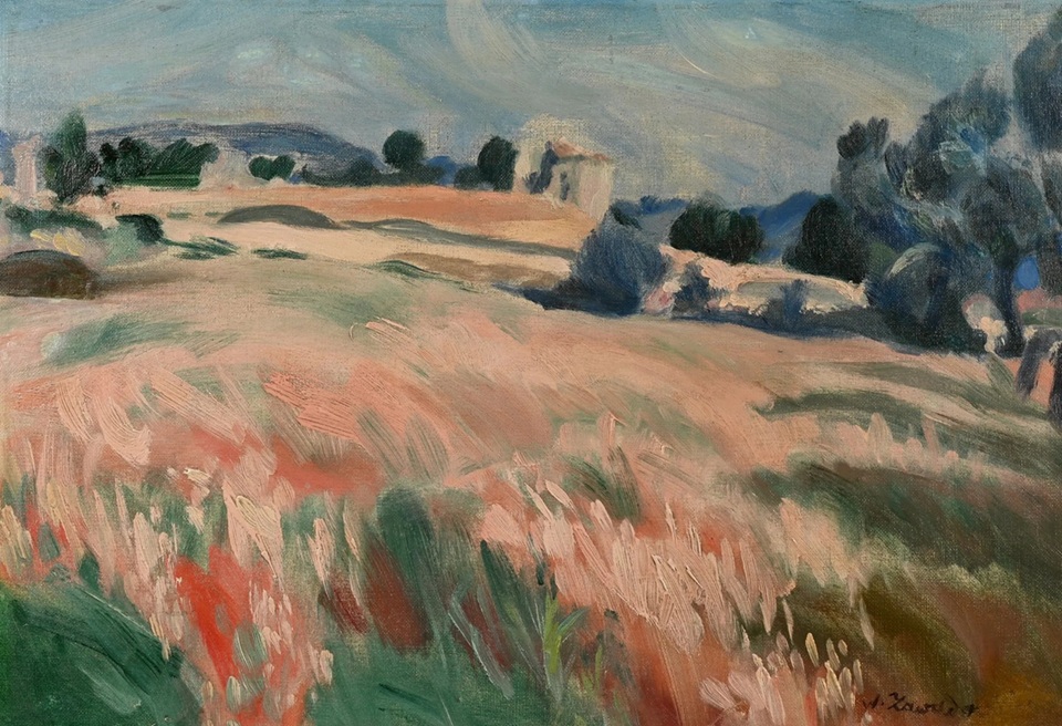 obrazu, aby stawało się istotą tak pejzażu, jak i przedmiotów w martwych naturach. Dlatego powierzchnia nieba z plastycznie uformowanymi obłokami czy powierzchnia ziemi układającej się kolorowymi pasmami w motywy drogi czy wzgórza, mają tę