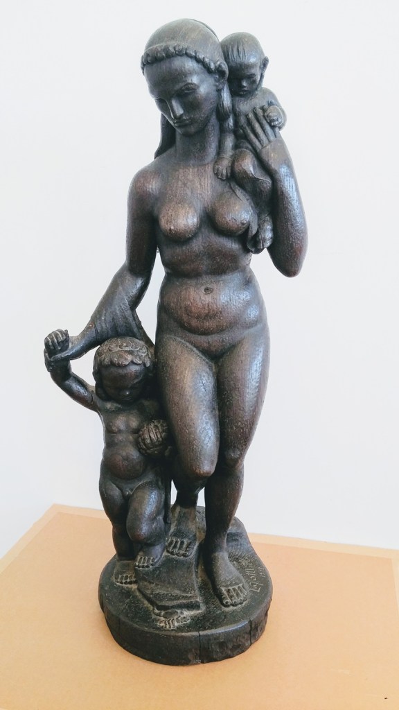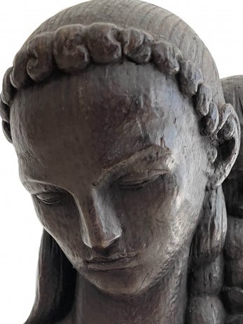 Lot 192. Leopold GOTTLIEB (1879-1933). Motherhood(1918). Sculpture, wood. Original artwork (unique). Certificate issued by gallery. Signature base. Size of the artwork 72 x 40 cm (28.35 x 15.75 in) . Condition: very good, considering its time. Artwork description: Extremely rare unique work, signed and dated. Private collection in Tel Aviv. In 1904, at the age of 21 he settled in Paris and became a member of the Circle of Montparnasse artists. Following his return to Paris. In the years 1917-1919, he took part in exhibition of Polish Expressionists (Formists) and became friends with another Polish artist, Moses Kisling, Eugene Zak and Mela Muter. His works were displayed in the Salon of Autumn, Independents, Société Nationale des Beaux Artes, and the Tuileries. He participated in exhibitions in the Vienna Secession. He also participated in the exhibition of Polish art, organized in 1912, at Galeries Dalmau in Barcelona.