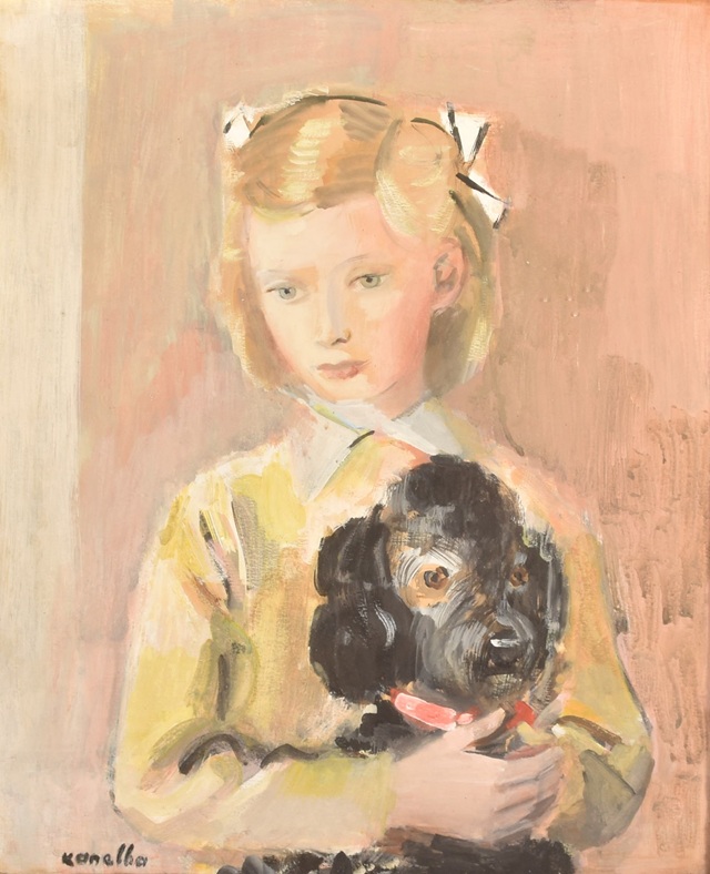 Lot 209. Raymond Kanelba (Polish, 1897-1960). A portrait of a young girl holding a small black dog on her knee, watercolour and gouache on canvas, signed to lower left, 64 x 52.5 xm, framed and glazed. Estimate £400 – £600. Aubreys Auctioneers. 03/27/25. SOld 1,400 GBP