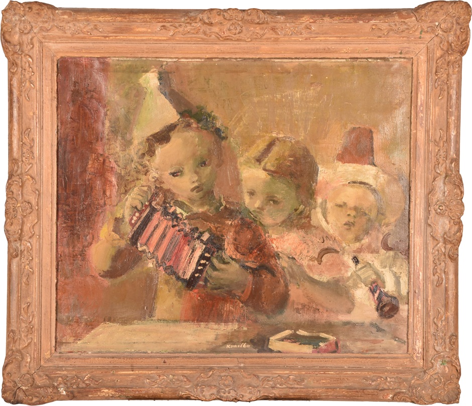 Lot 210. Raymond Kanelba (Polish, 1897-1960). A large painting depicting three young children playing various instruments and wearing novelty hats, oil on canvas, 63 x 75 cm, mounted in a ornate wood frame. Estimate £400 – £600. Aubreys Auctioneers. 03/27/25. Sold 4,200 GBP