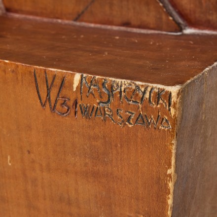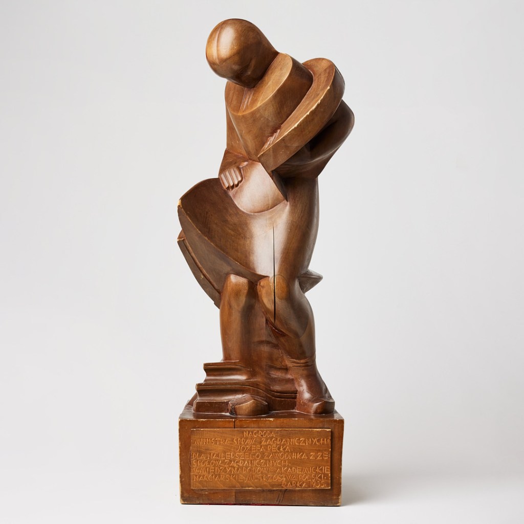 284. 3987627. WINCENTY KASPRZYCKI (POLEN 1906-1965), ZAKOPANE SCHOOL OF WOOD CRAFTS. Woman in Motion. Wood, height incl. plinth approx. 75 cm, width approx. 27 cm, depth 27 cm. Signed W. Kasprzycki, dated 31 Warsaw. The plaque on the front of the plinth with the following text: “Nagroda Minster spraw zagranicznych Jozef Beck. Dla najlepszego zawodnika z zespółow zagranicznych. In Miedzynarodowe academickie narcziarskie mistrzostwa Polski. Rabka in 1935.“. Other: Poland, Zakopane school of wood crafts/ Szkoła Zakopiańska,1931, made during the artist’s time in Roman Olszowski’s studio. Condition: Surface dirt, numerous cracks, chips, abrasions and scratches. Estimate: 4 554 – 5 465 EUR. Stockholms Auktionsverk. 03/20/25. Sold 240,000 SEK (21,800 euro)