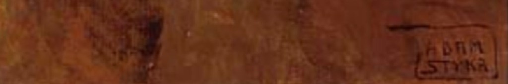 Obraz sprzedawany w Agrze-Art jest stosunkowo małego formatu o żółtej dominującej tonacji, chyba niespotykanej w pracach Adama Styki – zakładam, że fotografia dobrze oddaje kolorystykę rzeczywistej pracy. Obraz ten nie ma proweniencji co zwykle budzi zaniepokojenie. Powstaje oczywiście przypuszczenie, że jest to być może replika autorska nieznanej bliżej kompozycji lub może oryginalna kompozycja Adama Styki. Na niekorzyść autorstwa przemawia zły balans, czy też ‘środek ciężkości’ tej kompozycji, skierowany w lewą stronę patrzącego. W większości podobnych prac z prawej strony mamy dodatkowe postacie, stojącego czy siedzącego Araba, równoważące w ten sposób kompozycję. Najbardziej zbliżony do tej pracy jest obraz tutaj przedstawiony z numerem #4. Sygnatura obrazu z Agry-Art ma niespotykany krój liter. Zwraca uwagę zwałaszcza litera ‘A’ z daszkiem, malowana od poziomej górnej kreski, jak też w podobny i w podobny nietypowy sposób powstała litera ‘M’. Podałem 9 przykładów sygnatur Adama Styki z obrazów o podobnej tematyce – ta z obrazu z Agry Art jest zdecydowanie odmienna, nie spotykana na jego prawdziwych obrazach. Tej sygnatury zdecydowanie nie mógł położyć Adam Styka. Przyglądając się tej pracy, martwi mnie też bardzo zlokalizowane pasmo fioletu cienia łączącego się z żółcią słońca na ziemi – wydaje mi się, że te fiolety w innych pracach były kładzione w bardziej stonowany sposób. Dodatkowo, twarz pierwszoplanowej postaci, czyli Araba na osiołku, jest nieropoznawalna, twarz jest plamą, nie ma żadnych rysów. Na innych pracach postacie pierwszoplanowe mają cechy indywidualne. To wszystko razem budzi wątpliości odnośnie przypisania tej tej pracy Adamowi Styce. Liczy się także tzw. moje negatywne ‘pierwsze wrażenie’.