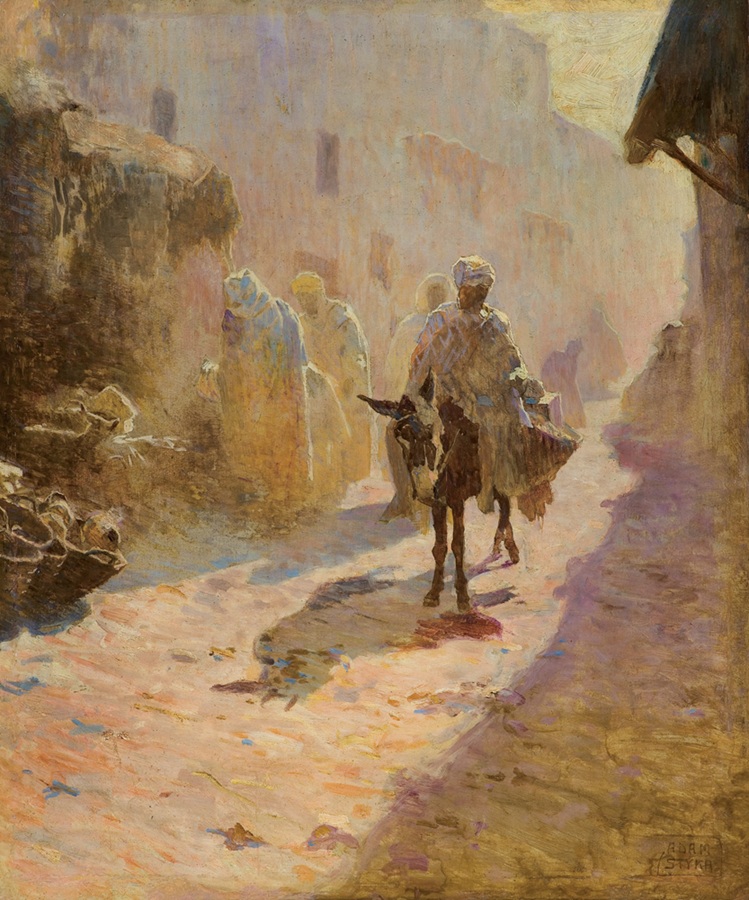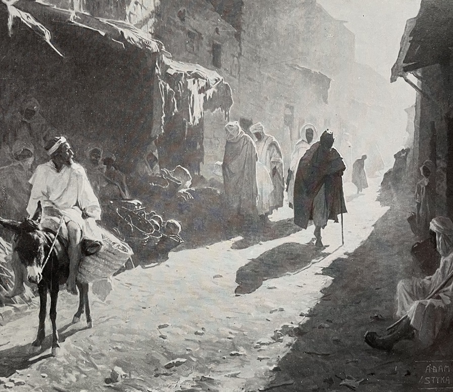 Do wpisu o dwóch pracach Adama Styki przedstawiających ‘Ulice marokańskie’ zainspirował mnie jeden z czytelników kręcący nosem na widok obrazu Uliczka w Marrakeszu z aukcji Desy-Unicum z 20 marca 2025 (lot 30, https://desa.pl/pl/aukcje-dziel-sztuki/sztuka-dawna-xix-wiek-modernizm-miedzywojnie-pr8o/adam-styka/scena-orientalna-ozgs/). Kilka dni po jego liście, gdy przeglądałem katalog Agry-Art z dnia 23 marca zainteresowałem się pracą o podobnej tematyce, czyli Uliczką w Biskirze (lot 66): https://sztuka.agraart.pl/560/0/12/6?_gl=1%2Aqxz0qf%2A_gcl_au%2AMjAzNjE0Mjg5My4xNzQyNjY3NzA2.