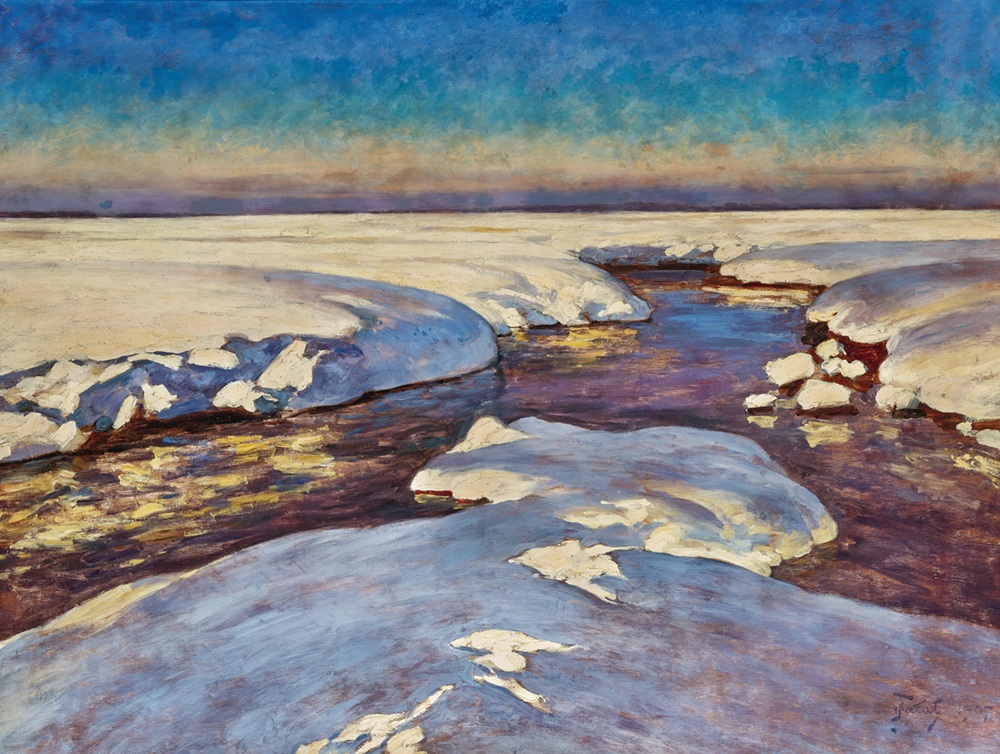 Julian Fałat. Sonnenuntergang über einem verschneiten Bachlauf, 1907