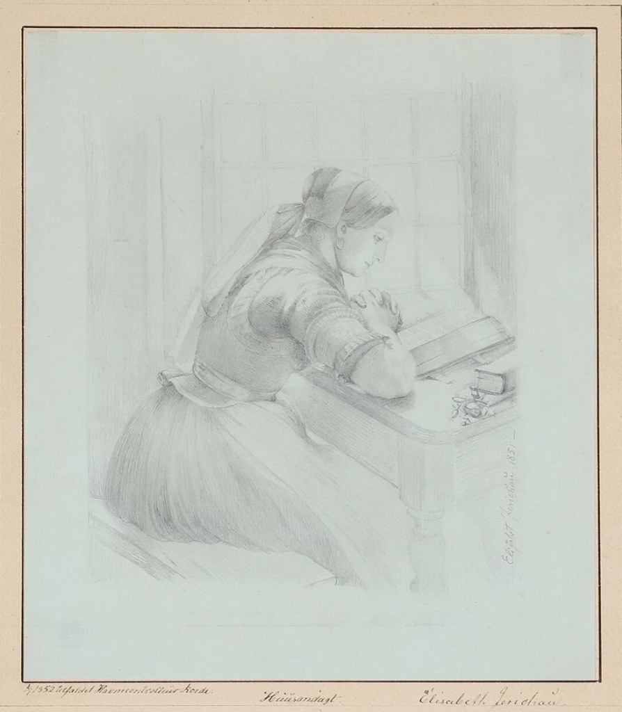 Lot 7129. Elisabeth Baumann (b. Warsaw 1819, d. Copenhagen 1881). “Huusandagt”. A young woman in a costume from the Hedebo region reading the Bible. Signed and dated Elisabath Jerichau 1851. Pencil on paper laid on paper. Sheet size 23×20 cm. Estimate 3,000–4,000 DKK ($425–$570). Rasmussen. 04/03/25. Sold 11,500 DKK ($1,620)