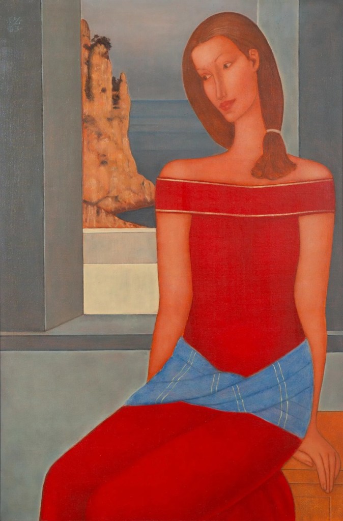 Lot 102. ROMAN ZAKRZEWSKI (POLISH 1955-2014). Model by the Sea, 2003, oil on canvas, 120 x 80 cm (47 1/4 x 31 1/2 in.), framed dimensions: 139 x 99 cm (54 3/4 x 39 in.), signed and dated with monogram upper left; signed and dated on verso. Estimate $8,000 – 12,000. Shapiro. 04/19/25. Sold $10,000.