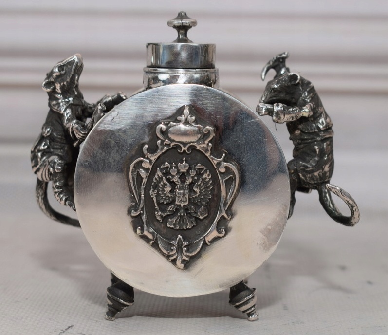 Lot 265. Silber. Auf vier ausgestellten, profilierten Rundfüßen der Korpus in Form eines liegenden Zylinders, darauf abgesetzter, runder Hals mit scharniertem Deckel und profiliertem Scheibenknauf. Die runden Seiten mit Eispickel bzw. Axt erklimmend zwei vollplastisch gearbeitete, bekleidete Ratten. Die glatten Seiten belegt mit jeweils von Rocaillen gerahmten, reliefierten Darstellungen des Hl. Georgs bzw. des Russischen Wappens. Gest. 84, Beschaumeister Andrej Antonowitsch Kowalkskij, Meistermarke Pawel Fedorowitsch Sasikov, dat.; Gew. ca. 215 g. H. 8 cm. 5,5 cm x 10 cm. Vgl. Goldberg, S. 42 und 54.